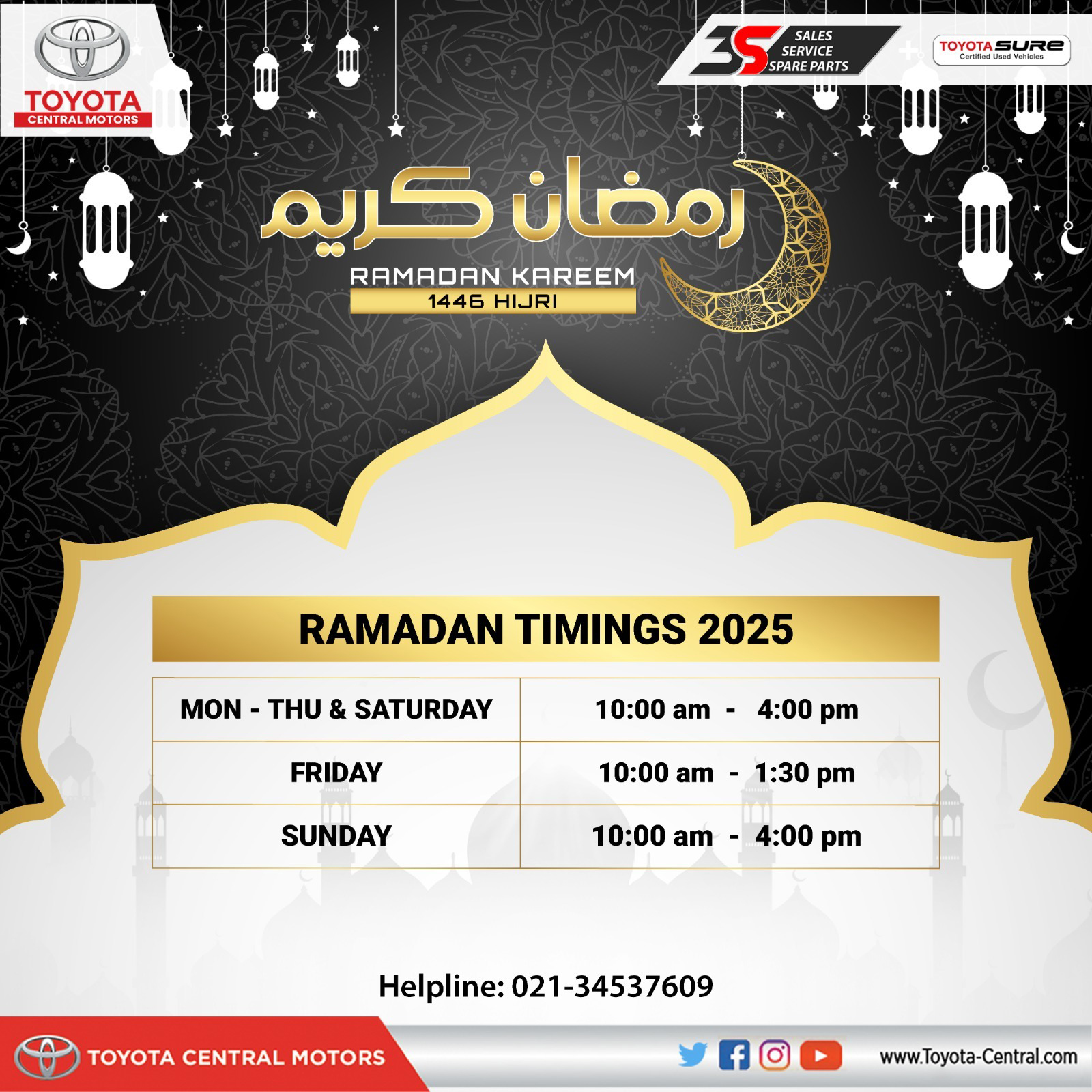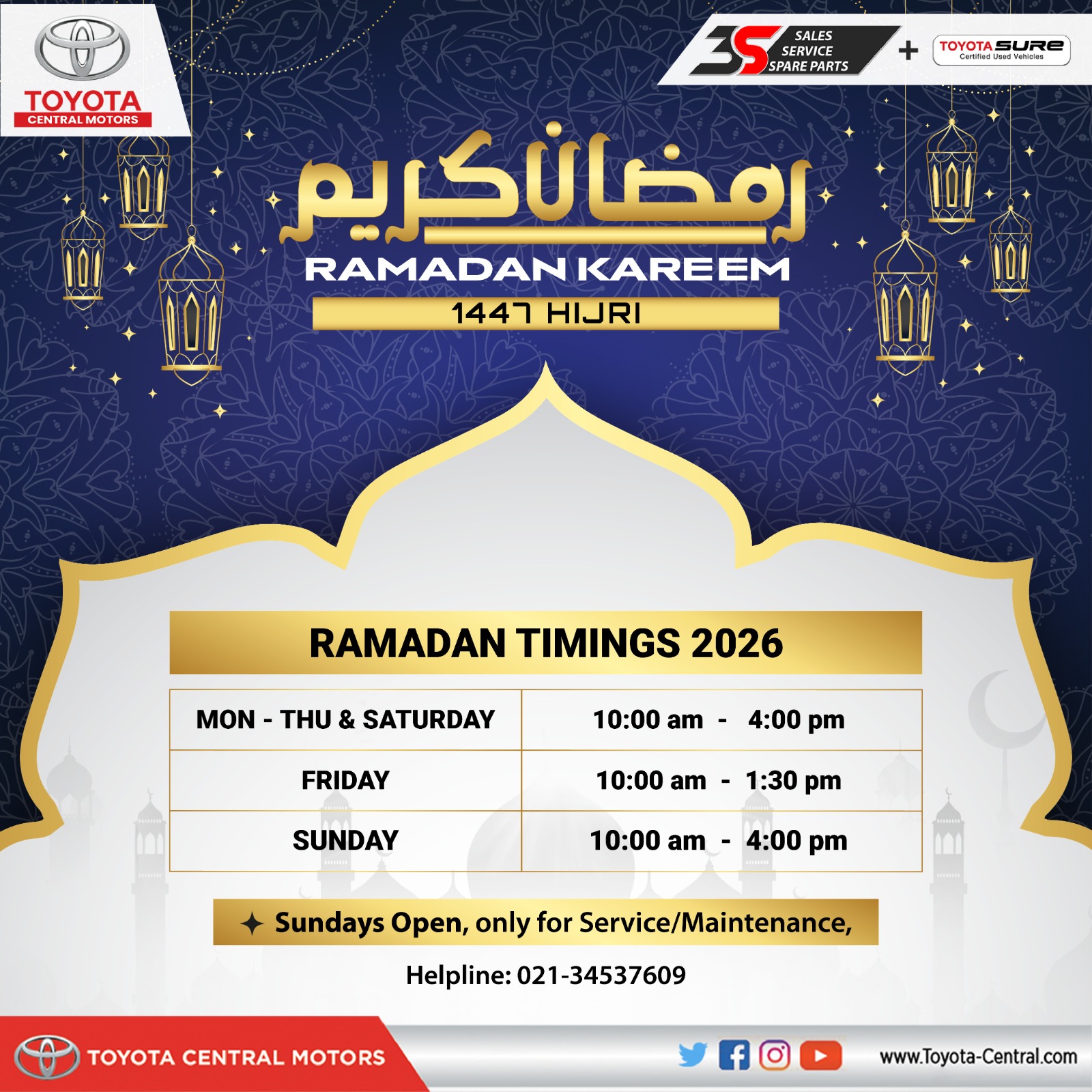 which was framed as per Toyota’s 4-S concept with workshop and spare parts facilities available under one roof. The trust and confidence shown by customers helped Toyota Central Motors flourish its business and within a short span became the strongest dealer of Toyota vehicles in Pakistan. Our customer’s constant support helped us extend our business and in the year 2000, we established a new dealership under the name of Toyota Society Motors on Khalid Bin Walid Road with the purpose of accommodating our valuable customers in the main auto market. Following after this, Toyota Shahrah-e-Faisal was established in 2008 with 1S facility.